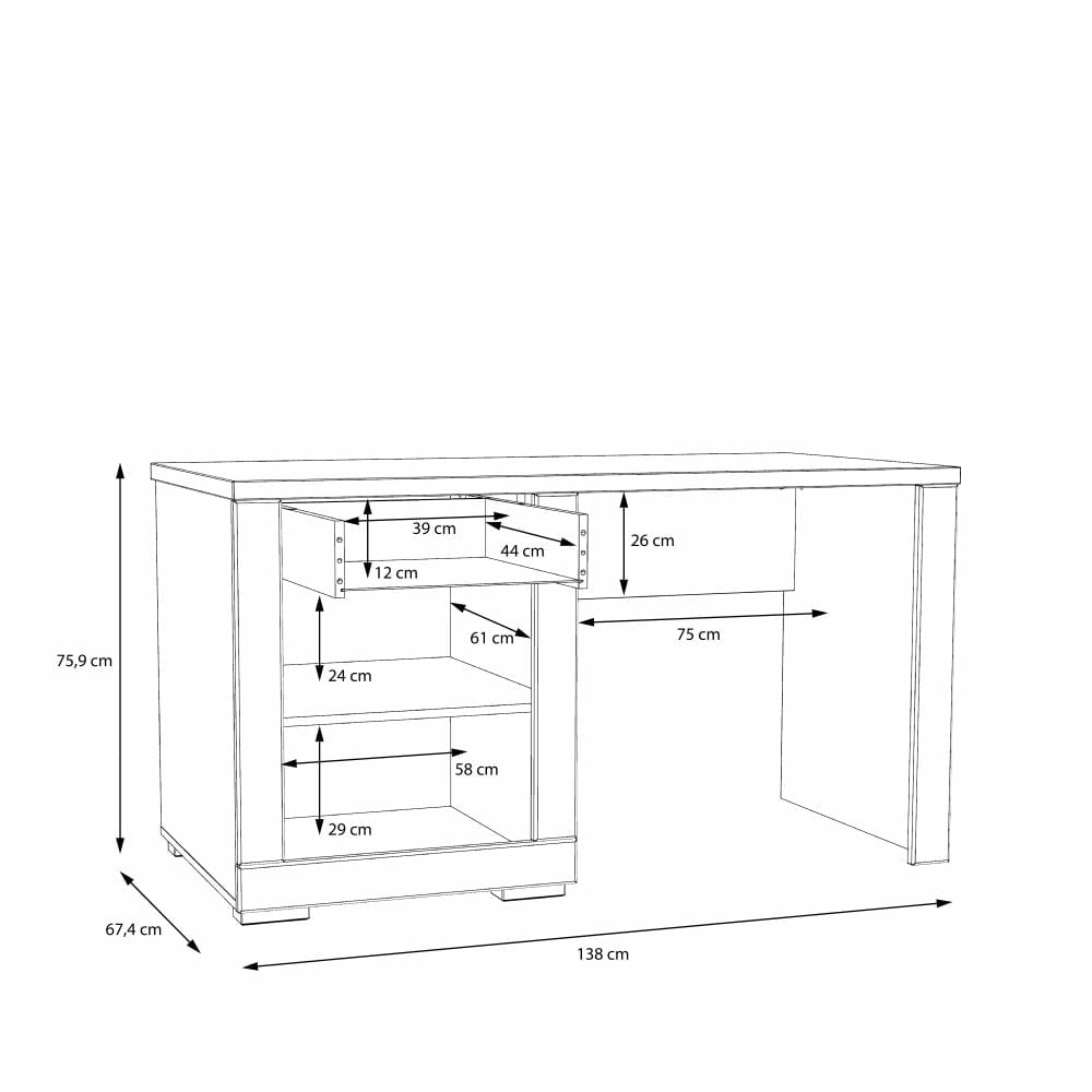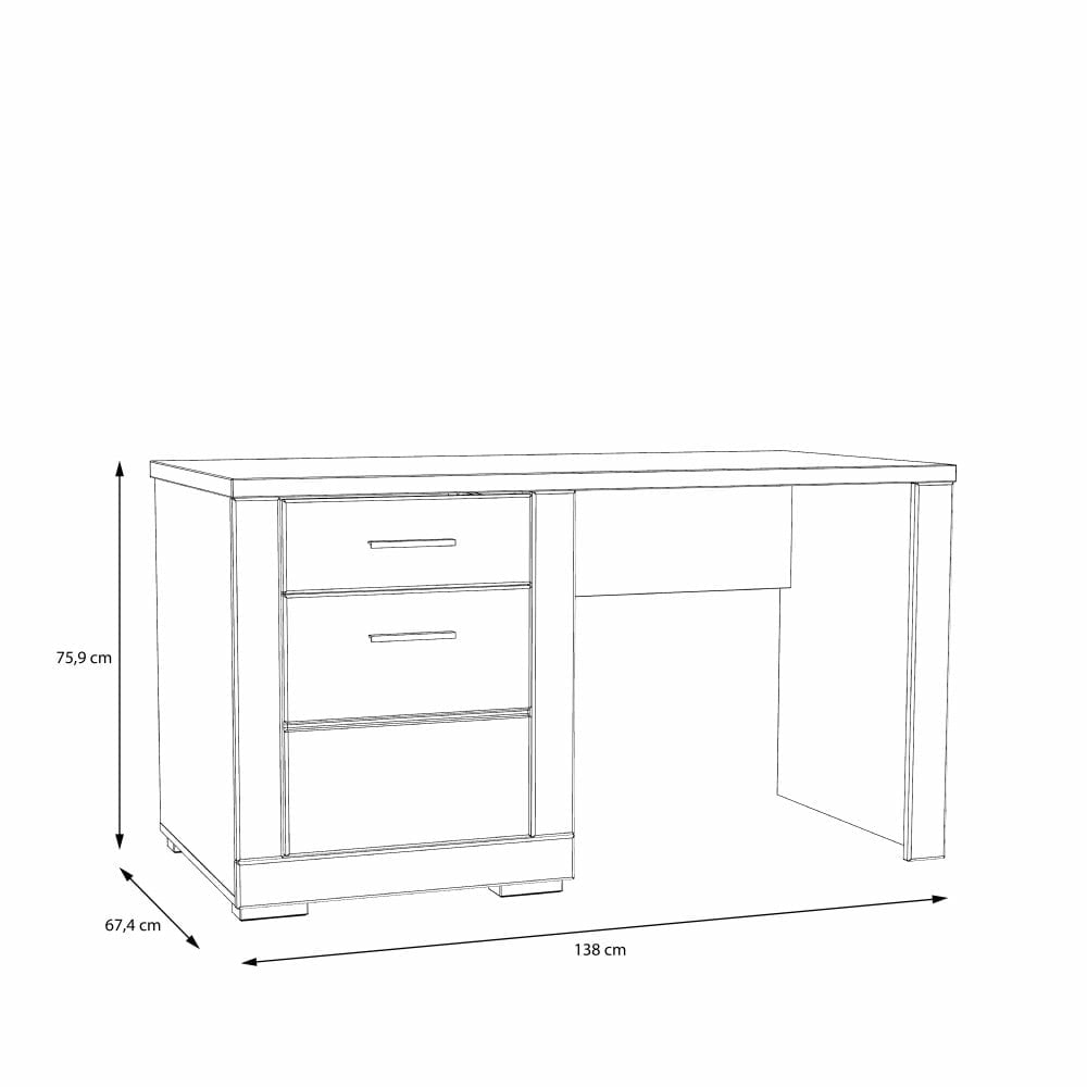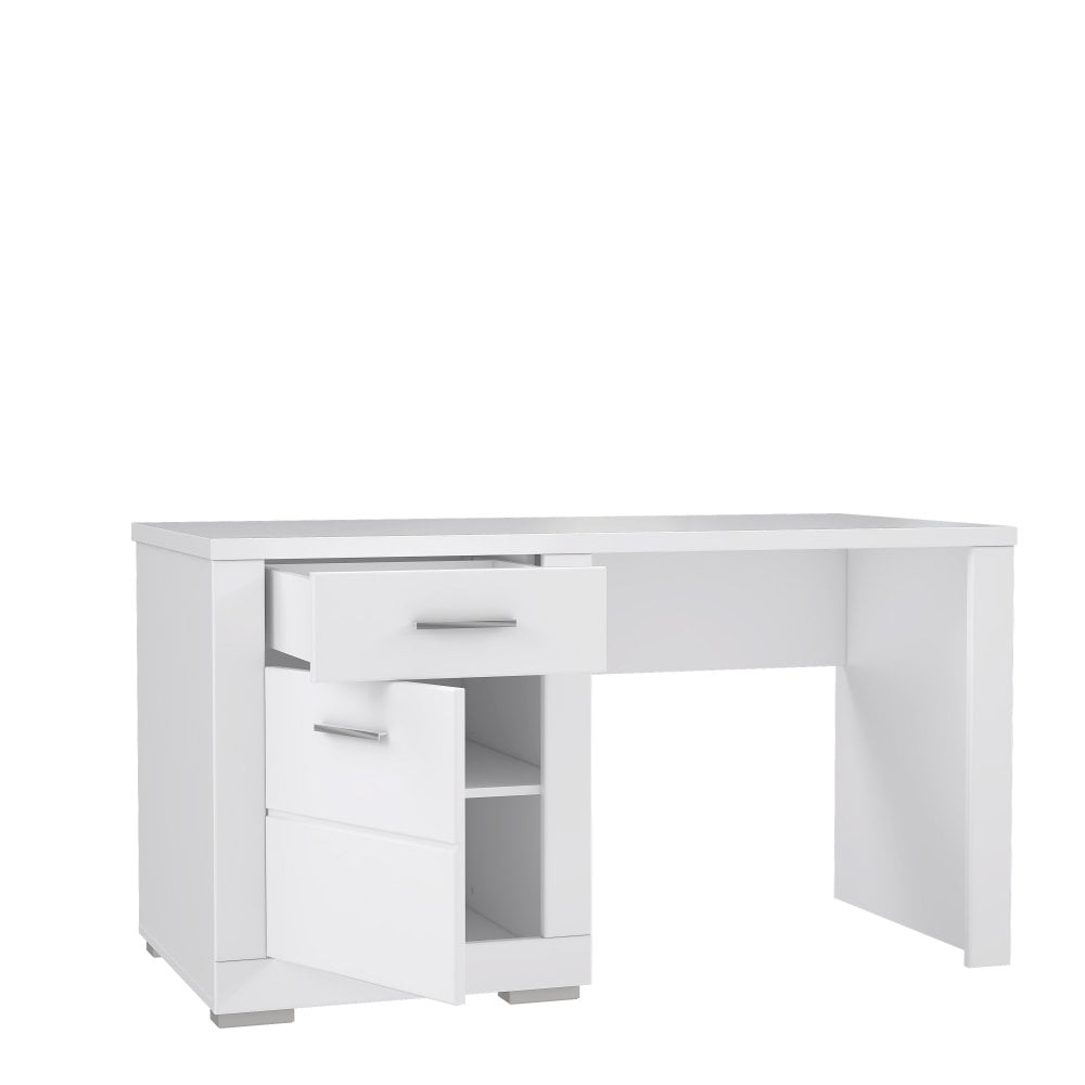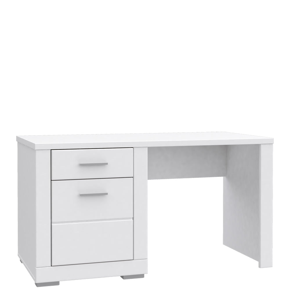 Nowoczesne biurko z kolekcji Snow zostało wykonane w białym kolorze i posiada dużą przestrzeń roboczą. Front szuflady i szafki osadzony został pomiędzy szerokimi ramami mebla. Całość została wykończona metalowymi uchwytami w kolorze chromu.