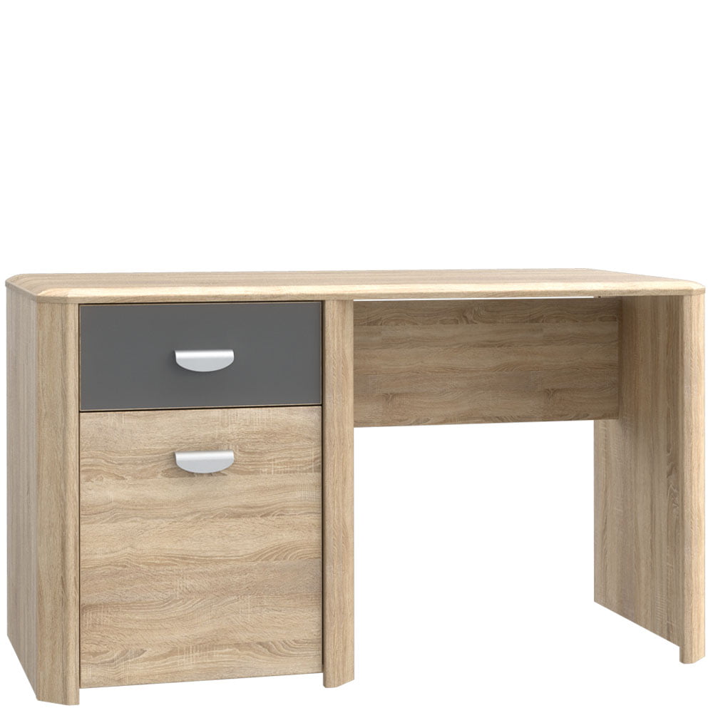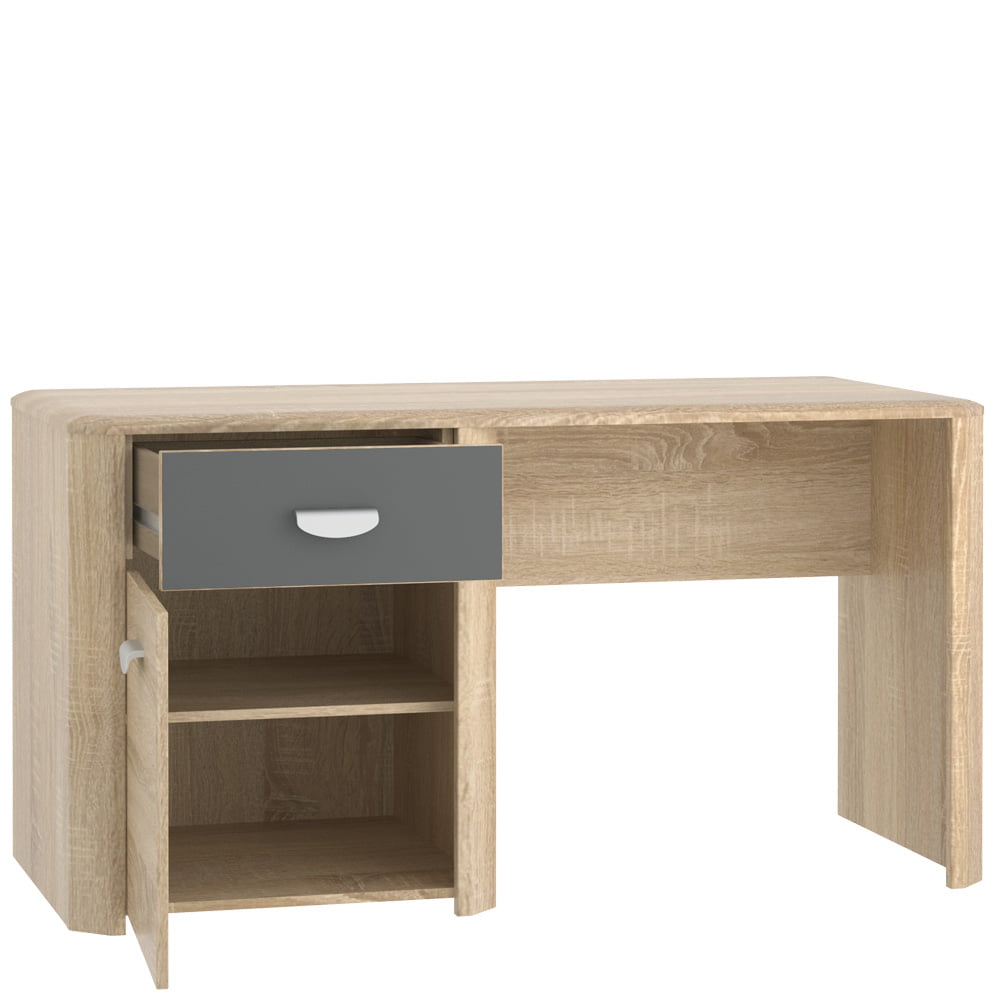 Biurko w kolorze Dąb Sonoma z szarą, matową wstawką oraz charakterystycznymi bocznymi ścięciami korpusu, to oryginalny mebel, stworzony zgodnie ze współczesnymi trendami, który z pewnością spodoba się wymagającej młodzieży. Biurko wyposażone jest w szufladę oraz dwie obszerne półki ukryte za frontem szafki, co ułatwia utrzymanie porządku w pokoju nastolatka.