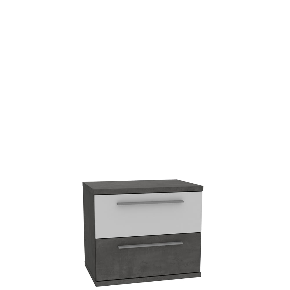 Szafka nocna z kolekcji JULIETTA to niezbędny element sypialni. Szafka wyposażona w dwie szuflady będzie idealnym miejscem na lampkę nocną lub wieczorną lekturę. Połączenie Ciemnoszarego betonu na elementach korpusu oraz białych, połyskujących frontów rozświetli niemal każde wnętrze. Całość subtelnie podkreślają szerokie uchwyty w kolorze aluminium.