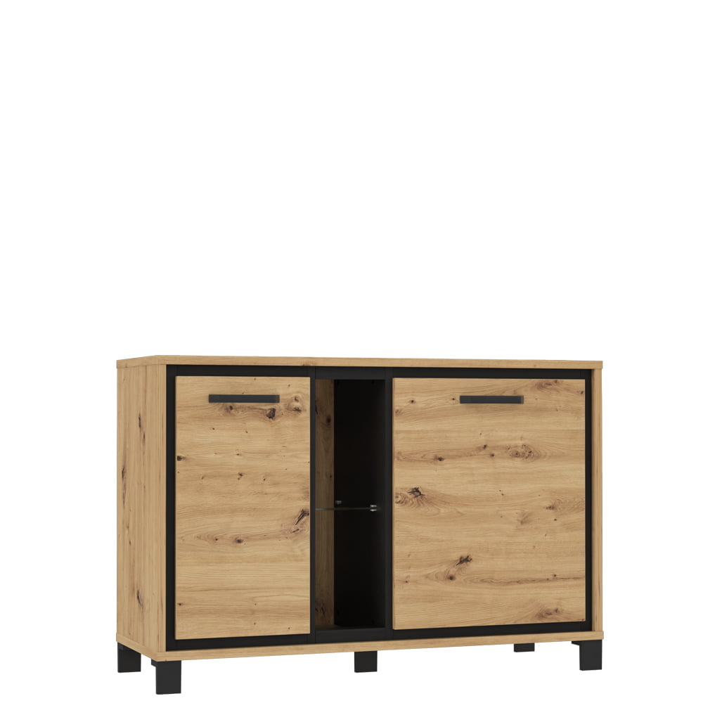 Cechą charakterystyczną komody i niewątpliwą dekoracją jest listwa w dekorze Dąb Czarny zamontowana wewnątrz korpusu, tworząc efektowną, wyrazistą linię wokół frontów bryły. Dopasowane stylistycznie dodatki – czarne metalowe uchwyty i wysokie nóżki są uzupełnieniem całości i podkreślają nowoczesny design mebla. Na wnętrze mebla składają się dwie zamykane szafki z półkami oraz otwarte wnęki ze szklaną półki, w których idealnie zaprezentują się modne dekoracje. Komfort użytkowania zapewni mechanizm z hamulcem zamontowany w drzwiczkach mebla, zapewniający lekkie i wygodne zamykanie.