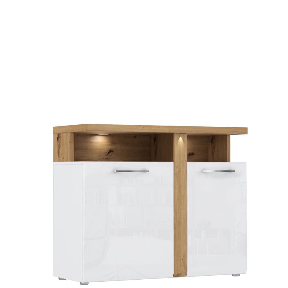 Elegancka komoda z kolekcji TULUZA mimo prostego kształtu nie nudzi, a zachwyca. Na uwagę zasługuje listwa dzieląca mebel, która jest przesunięta lekko w prawo. Ciekawe połączenie oddającego usłojenie drewna Dębu Artisan z Białym Połyskiem podkreśla nowoczesną stylistykę mebla. Komoda posiada 2 otwarte półki i 4 półki skryte za frontami zakończonymi metalowymi uchwytami w kolorze chromu. Szafki posiadają system cichego domyku. Mebel można podświetlić opcjonalnym, ledowym oświetleniem. Oświetlenie IZLED09-02 dostępne za dodatkową opłatą ( klasa energetyczna A+)