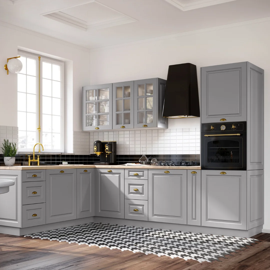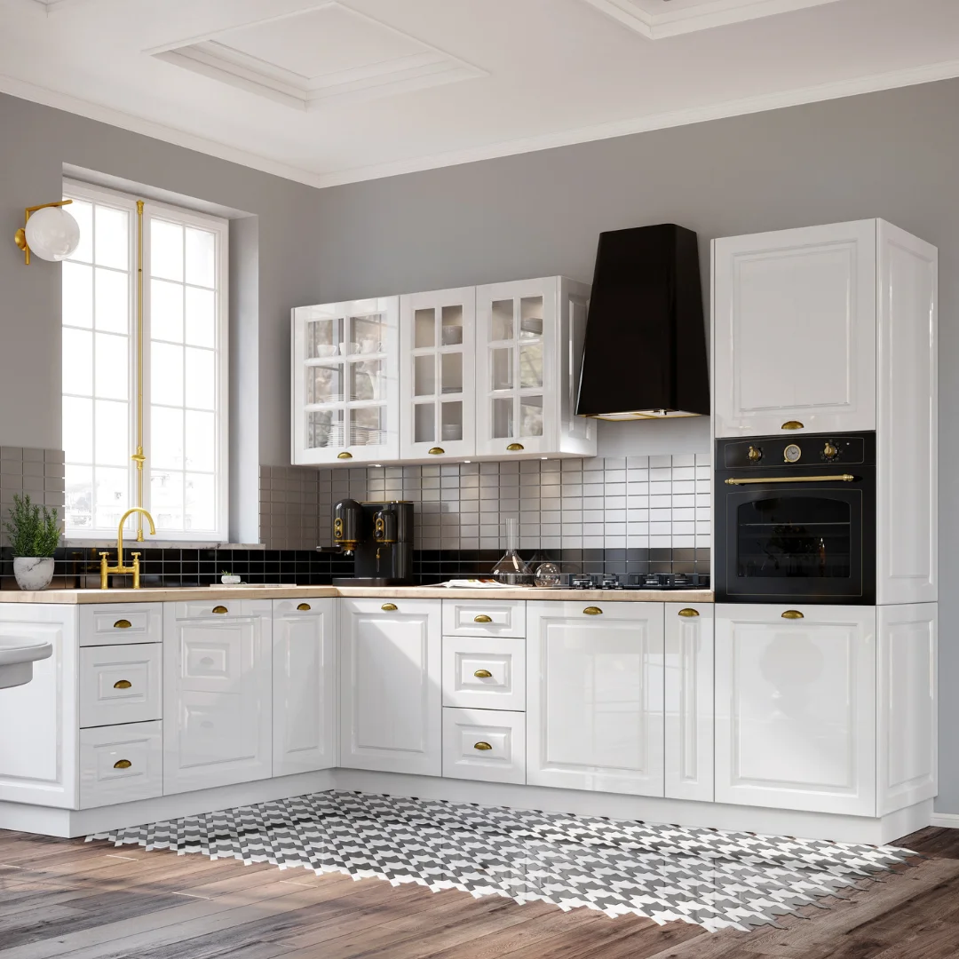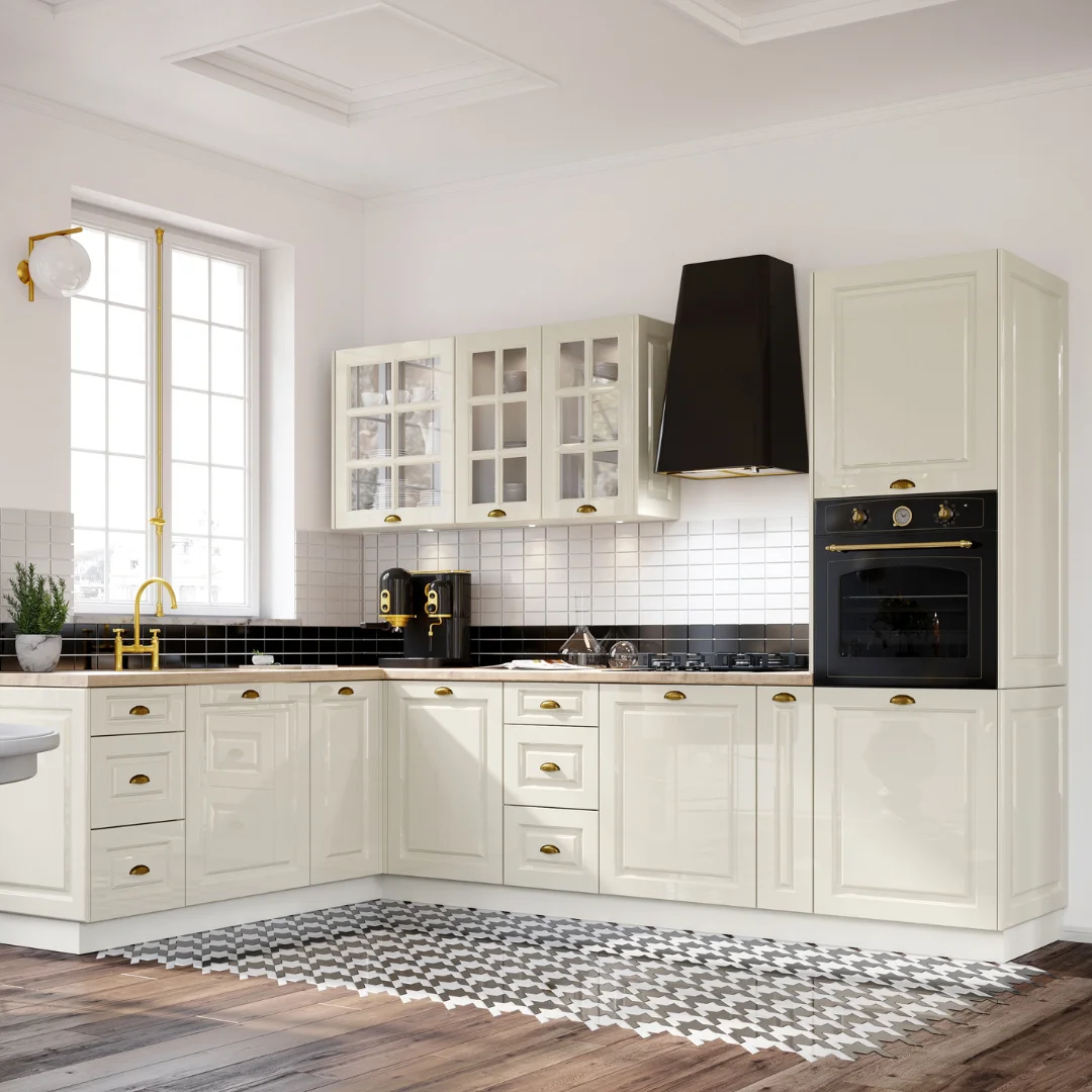 Ale to tylko jeden z powodów, dla których warto zwrócić uwagę na zestaw mebli kuchennych Alina Lakier. Zestaw ten zaprojektowano z wyjątkową dbałością o szczegóły. Wymienić tu trzeba przede wszystkim listwy, którymi można zwieńczyć górne szafki kuchenne, ale przede wszystkim frezowane fronty, dzięki którym stworzysz wyjątkowo stylowe projekty kuchni. Niezwykle efektownie wyglądają również stylizowane uchwyty – muszelki lub gałki w stylu retro. Nieco ciemniejsze – szare, czarne lub pozłacane, cudownie odcinają się od jasnych powierzchni frontów, stanowiąc ukłon zarówno w stronę funkcjonalności, jak i estetyki.