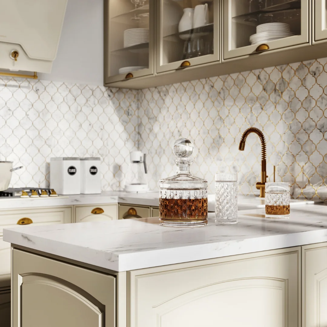 Co ciekawe, tak frezowane fronty mogą być użyte nie tylko jako drzwiczki szafek, ale również jako obudowa bocznych ścian korpusów szafek. Ma to znacznie zwłaszcza gdy zabudowa stanowić będzie aneks kuchenny, albo gdy planujemy wyspę kuchenną. Wówczas te dekoracyjne elementy domkną kompozycję i będą cieszyć oczy osób wypoczywających w salonie. Uzupełnieniem tej kuchennej aranżacji będą stylizowane uchwyty – złote, miedziane bądź czarne, a także ozdobne listwy wieńczące szafki.
