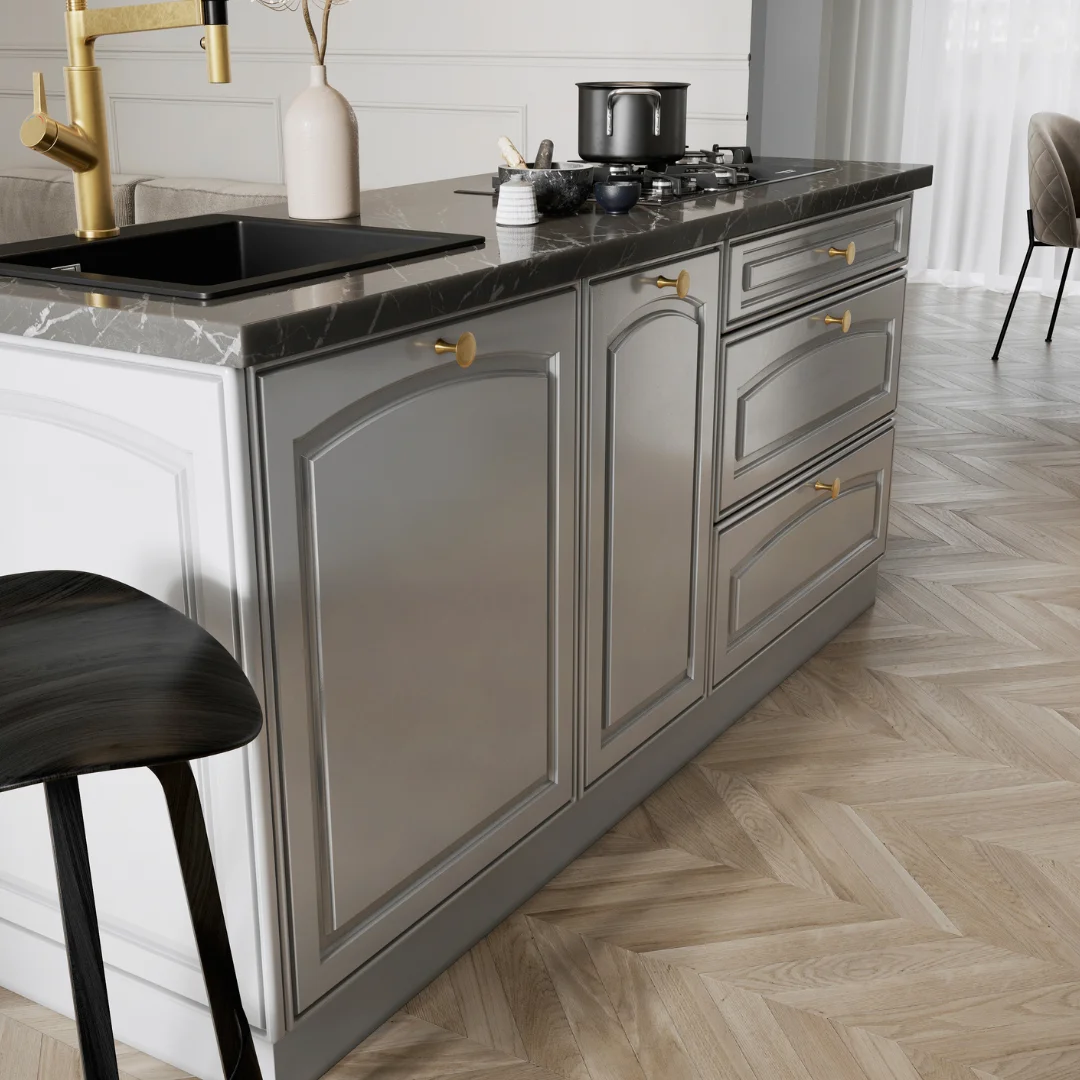 Ale to nie wszystko. Jeśli chcemy by nasza kuchnia była dopracowana do absolutnej perfekcji, sięgnąć powinniśmy również po dodatki i elementy uzupełniające. Mowa tu przede wszystkim o stylizowanych mosiężnych uchwytach oraz przeszklonych frontach, za pomocą których stworzyć możemy efektowne i tak charakterystycznych dla tego stylu witryn i kredensów. Kropką nad i będą kuchenne blaty robocze. I tu wybór mamy bardzo bogaty. Wśród dostępnych opcji są blaty inspirowane naturalnym drewnem m.in. dębiną i orzechem, a także modnymi dziś kamieniami – marmurem, granitem i trawertynem. Utrzymane są one w różnych odcieniach, dzięki czemu bez trudu dopasujemy je do kolorystyki zabudowy kuchennej.