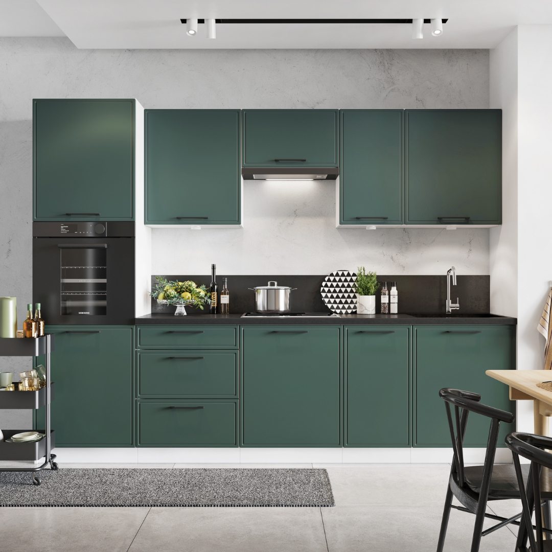 Zestaw mebli kuchennych EMILY stanowi propozycję dla osób ceniących sobie minimalizm połączony z komfortem codziennego użytkowania. Prosta, geometryczna forma frontu oraz ich uniwersalny charakter dają wiele możliwości podczas projektowania kuchni. Uroku nadaje jej frezowanie, tworzące wzór delikatnej ramki wokół krawędzi frontu. Fronty mebli kuchennych EMILY wykonane z foliowanej płyty MDF o grubości 16 mm, dostępne są w czterech wariantach kolorystycznych o matowym wykończeniu: ponadczasowej bieli, umiarkowanej szarości, butelkowej zieleni oraz klasycznej czerni. Na pozór klasyczna kuchnia, bez problemu sprawdzi się w nowoczesnym wnętrzu, a wszystko to, za sprawą dowolnie wybranego uchwytu oraz blatu, który znajdziesz w aktualnej ofercie producenta mebli STOLKAR. Meble kuchenne EMILY produkowane są pod indywidualne zamówienia klientów. Tak więc nie zwlekaj ze złożeniem zamówienia. Wybierając kuchnię z systemu Trend Line przekonasz się, ile możliwości zyskujesz dzięki nowoczesnym systemom kuchni modułowych. Jeżeli nasuwają się pytania, jakiekolwiek niejasności, jesteśmy do Twojej dyspozycji.