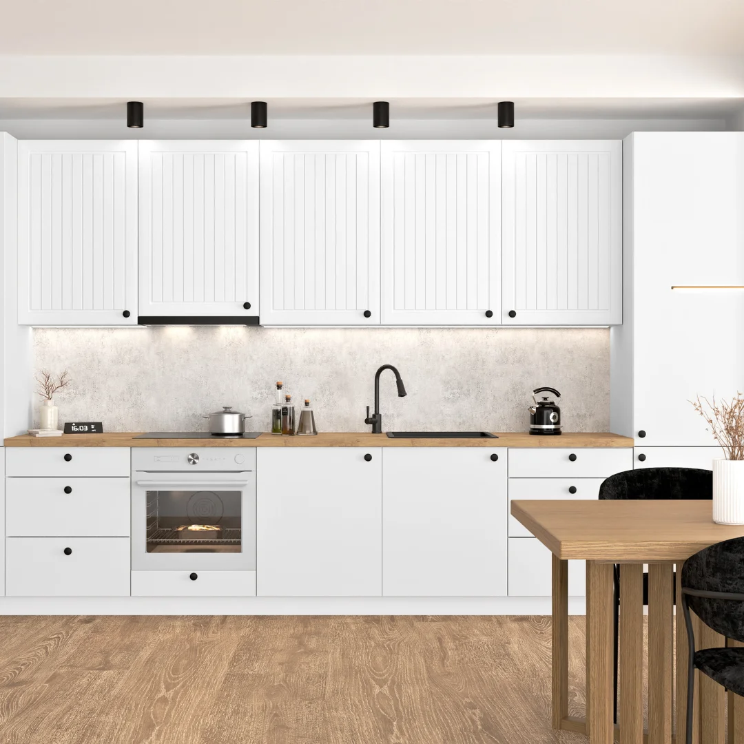 | Kolor frontów szafek górnych: | BIAŁY GROSZEK MAT / JASNY SZARY MAT / ZIELONY MAT / COFFE MAT. |