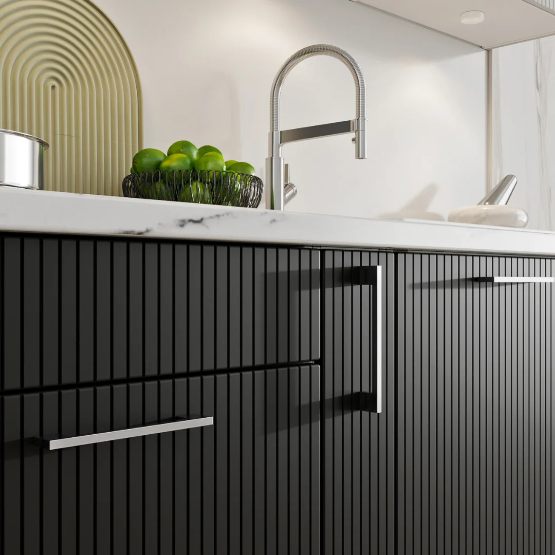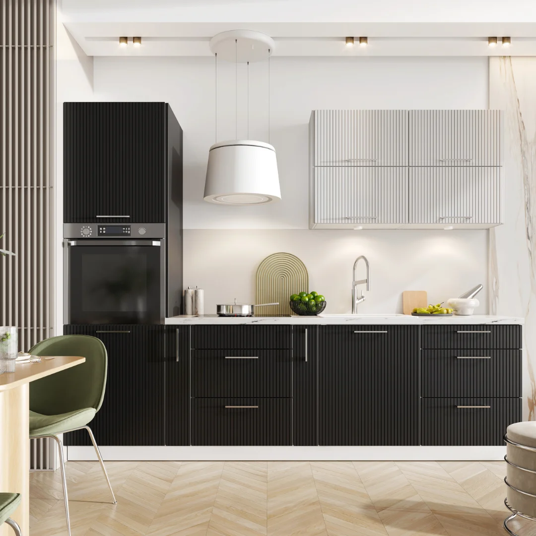 Zestaw mebli kuchennych KATE wyróżnia się ponadczasową kolorystyką, fronty mebli dostępne w czterech kolorach: jasnoszary mat, biały groszek mat, szary dust gray mat, a także czarny groszek mat. Dodatkowo fronty szafek na wymiar przyozdobione są subtelną, frezowaną ryflą, wykonaną z foliowanej płyty MDF o grubości 16mm, która bardzo mocno nawiązuje do mebli kuchennych w stylu retro . KATE, to połączenie minimalizmu, nowoczesności oraz klasycznej elegancji w jednej formie, a delikatne frezy interesująco urozmaicają jednobarwne powierzchnie. Chcąc zadbać, o nietuzinkowy charakter naszej aranżacji pomieszczenia kuchennego pamiętaj o doborze dodatków, takich jak uchwyty, oświetlenie, sprzęty AGD czy blaty do szafek stojących, dzięki tym elementom możesz jeszcze bardziej spersonalizować swoją kuchnię marzeń. Oferta na dodatkowe elementy dekoracyjne naszej kuchni, dostępna w naszym katalogu meblowym. Meble kuchenne KATE znakomicie prezentują się zarówno osobno, jak i w towarzystwie innych modeli z kolekcji Trend Line, co także daje nam ogromne możliwości aranżacyjne. Jako producent mebli kuchennych przygotowaliśmy dla Was inspirację i połączyliśmy w duet dwie nasze nowe kuchnie KATE & MAX, jak Wam się podoba takie zestawienie?
