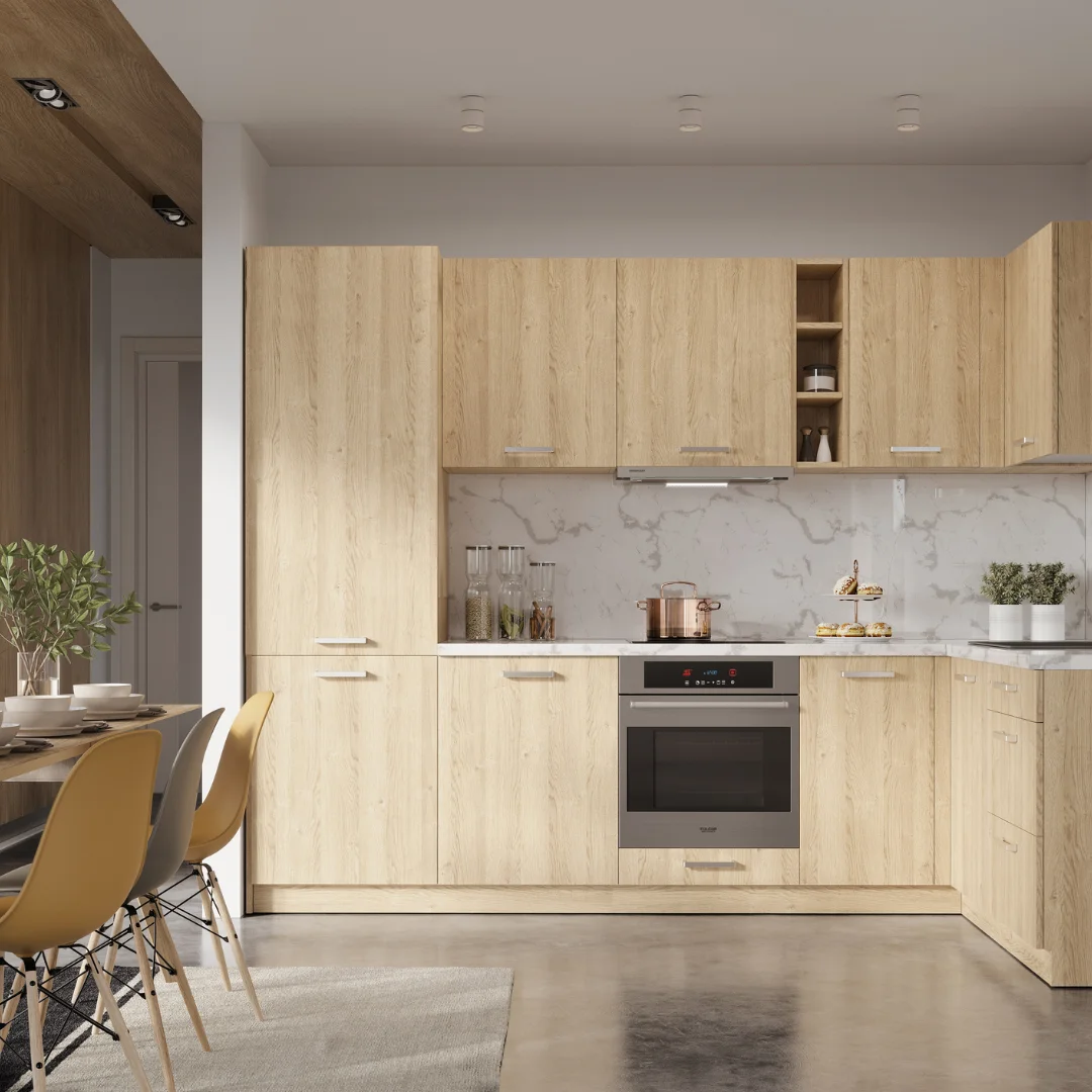 Jeśli zdecydujemy się na wzory inspirowane drewnem, otrzymamy kuchnię będącą sercem domu. Przytulną i ciepłą, pasującą do mieszkań i domów zaaranżowanych przez miłośników spokojnego stylu życia. Co warte zauważenia, wybór ten będzie jednocześnie znakomitą i ekonomiczną alternatywą dla znacznie droższych oklein naturalnych. Płyty zastosowane w kuchni Oliwia są znacznie wytrzymalsze niż fornir – nie zmienią koloru, ani nie wyblakną. Zastosowana na ich powierzchni struktura synchroniczna idealnie odwzorowuje układ słojów, a szeroka paleta kolorystyczna dekorów umożliwi maksymalnie indywidualny wybór.