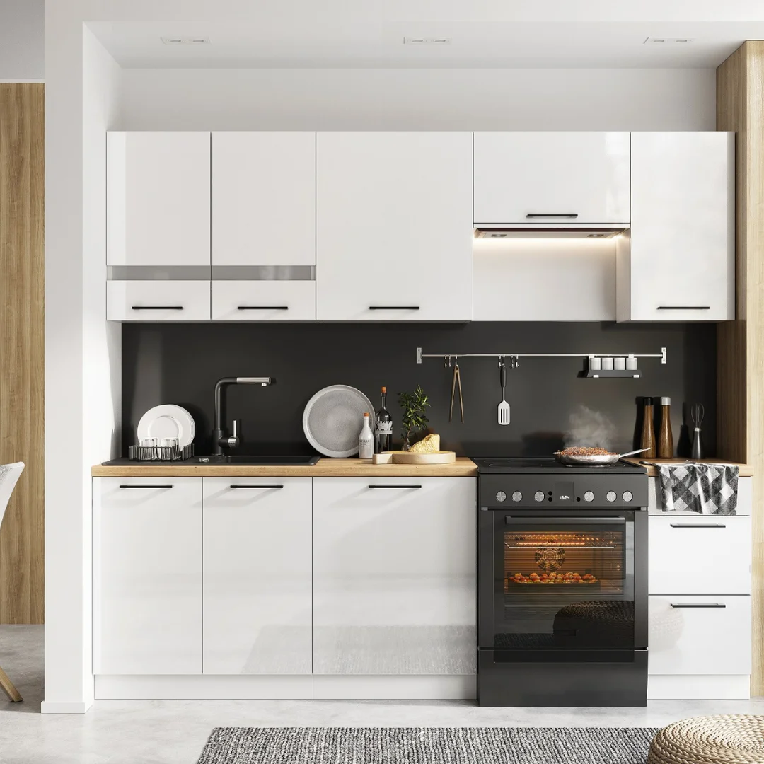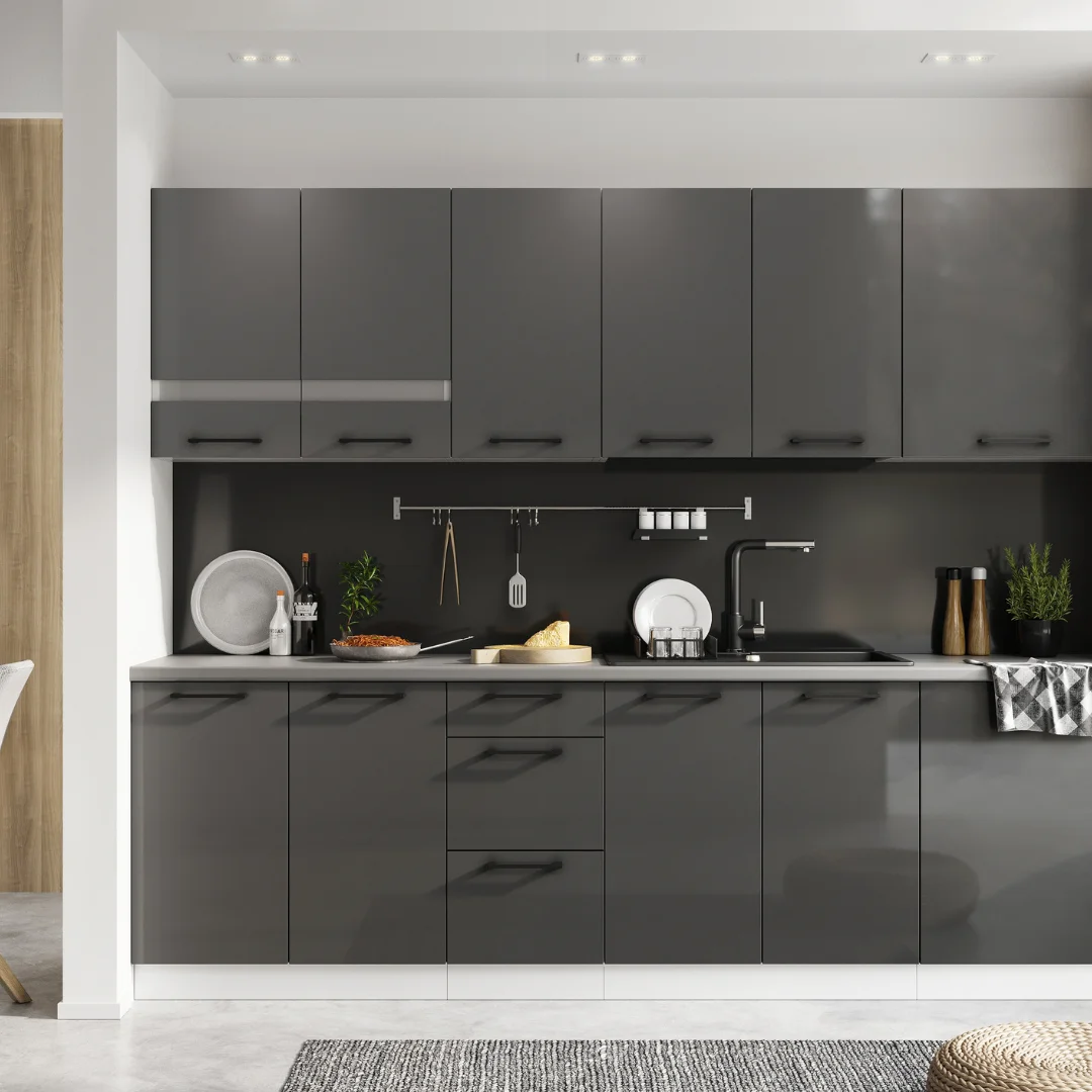 Zestaw mebli kuchennych Oscar to kuchnia posiadająca wysokiej jakości fronty akrylowe, które doskonale prezentują się w nowoczesnych wnętrzach. Kuchnia ta jest świetną alternatywą dla osób stawiających na funkcjonalność przy zachowaniu lekkości wyglądu. Starannie wyselekcjonowany zestaw nowoczesnych mebli kuchennych, odznacza się wysokim połyskiem gładkich frontów akrylowych. Fronty te dostępne są w dwóch wersjach kolorystycznych: biały połysk i antracyt połysk. Całości dopełnia korpus w kolorze białym, który idealnie współgra z kolorystyką frontów.