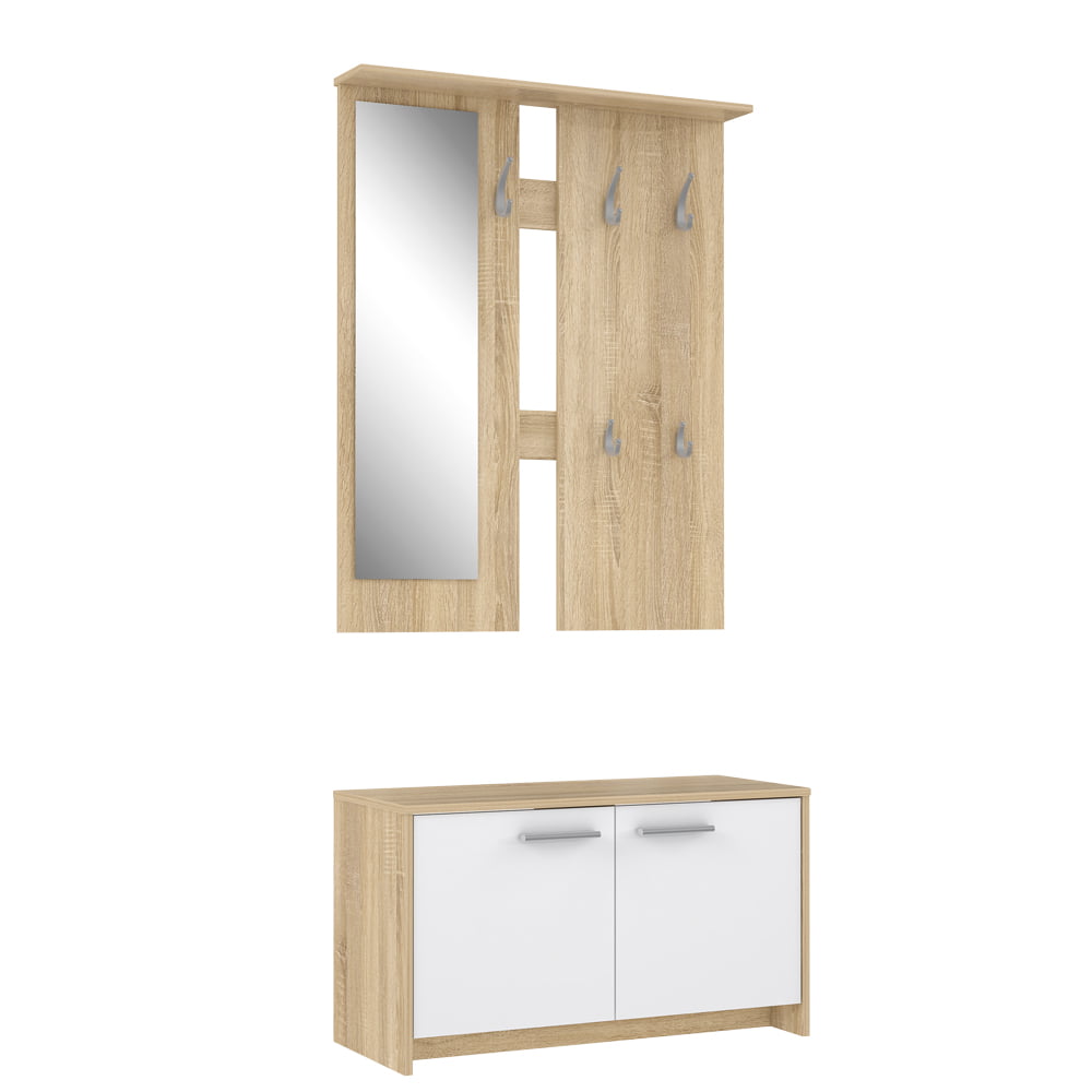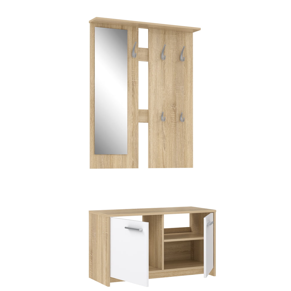 Dekor Dąb Sonoma odwzorowujący naturalne drewno z bielą doda pomieszczeniu ciepła i podkreśli jego elegancję . Wbudowane lustro optycznie powiększy przestrzeń w korytarzu i ułatwi dobór codziennej garderoby.