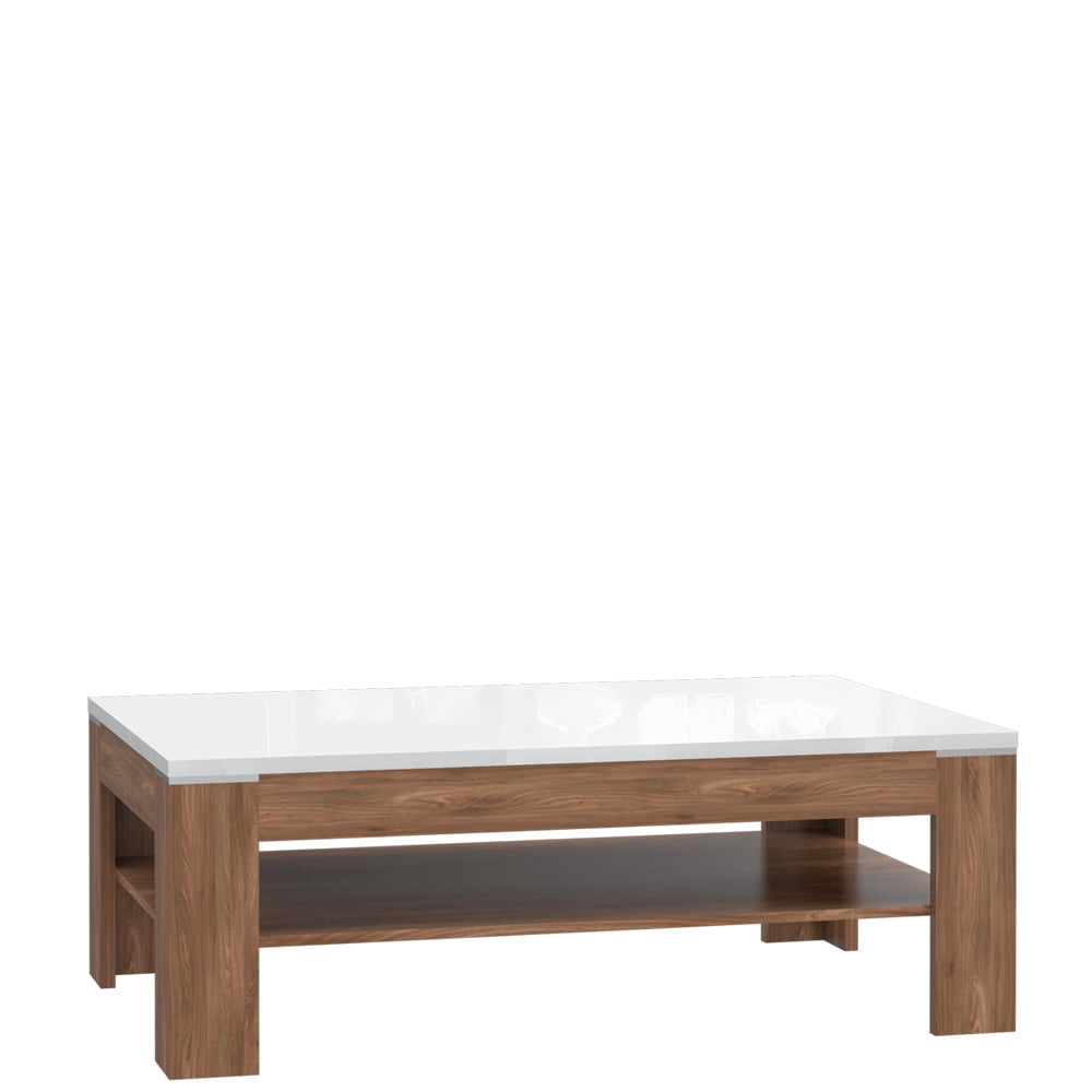 Stolik z kolekcji Saint Tropez posiada blat w kolorze biały połysk, a pozostałe elementy w ciepłym dekorze Dąb Sangallo. Dodatkowa dolna półka stolika jest idealnym miejscem do przechowywania gazet i czasopism, które zawsze warto mieć pod ręką podczas popołudniowego odpoczynku. Mebel doskonale pasuje do dużego, nowoczesnego salonu.