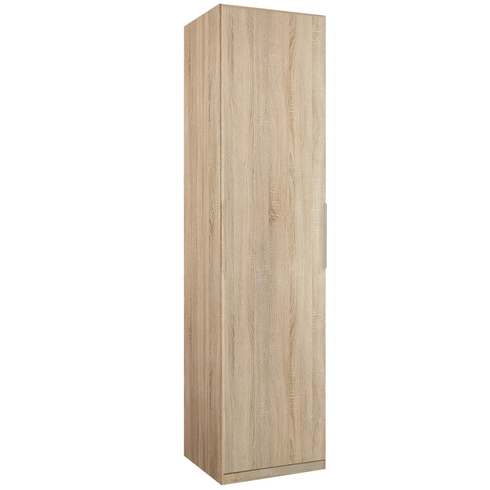 Wąska szafa w dekorze Dąb Sonoma posiada pięć wnęk do przechowywania złożonej odzieży lub segregacji innych niezbędnych rzeczy. Neutralne wzornictwo i kolorystyka umożliwiają wykorzystanie jej w różnych pomieszczeniach domu czy mieszkania. Można uzupełnić aranżacją ustawiając ją jako samodzielny mebel, ale też połączyć z innymi szafami z tej samej kolekcji, tworząc ciekawe i funkcjonalne zestawy szaf do sypialni, garderoby czy też pokoju młodzieżowego. Elegancji dodadzą jej ozdobne listwy wykończeniowe w kolorze pasującym do dekoru szafy (dostępne opcjonalnie) oraz smukły, pionowy uchwyt w srebrnym kolorze.