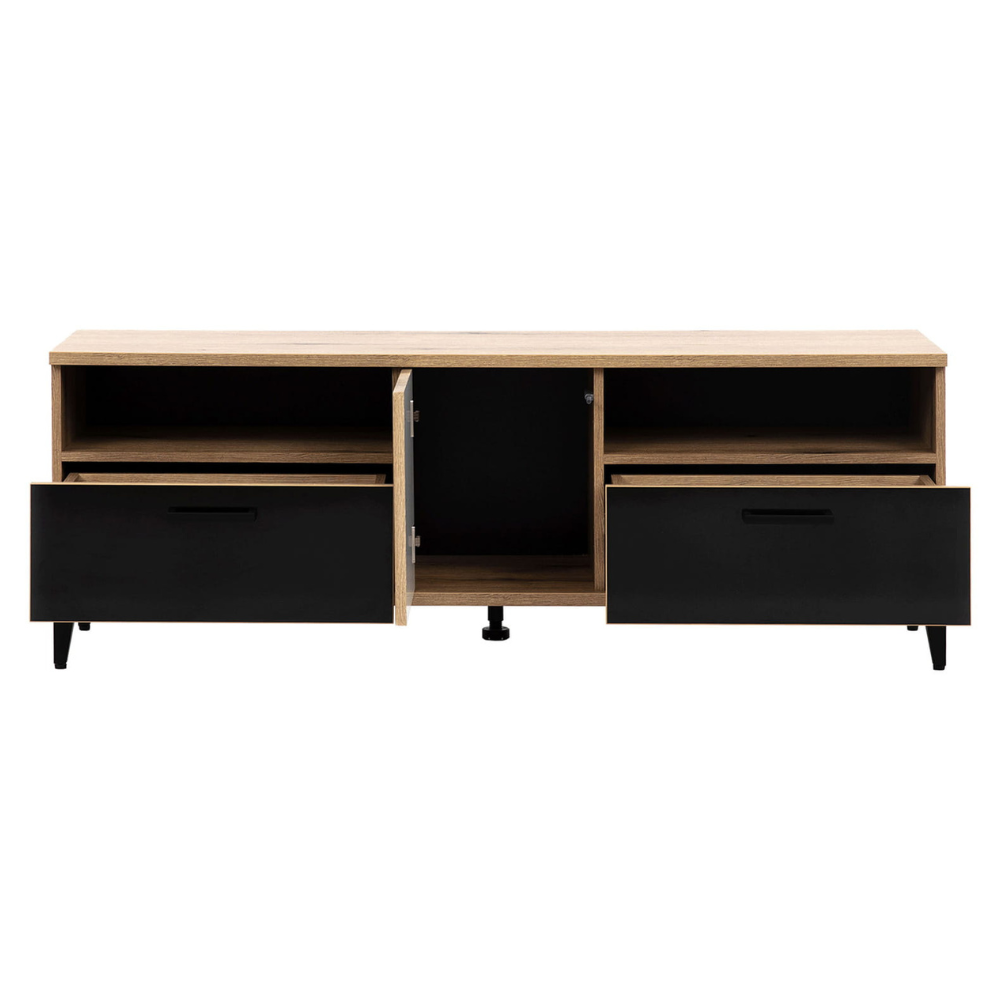 - Mebel wyposażony został w dwie pojemne szuflady, zamkniętą przestrzeń oraz dwie otwarte wnęki.