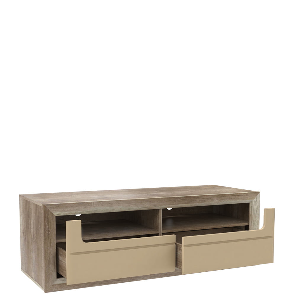 Stylowa szafka RTV z kolekcji TIZIANO to nowoczesny mebel, który wspaniale będzie prezentować się w salonie. Korpus szafki wykonano w dekorze Dąb Antyczny, idealnie odwzorowującym strukturę usłojenia drewna, a fronty w kolorze beżowym o wysokim połysku. Mebel posiada 2 otwarte półki na sprzęt RTV oraz 2 półki skryte za oryginalnie frontami.
