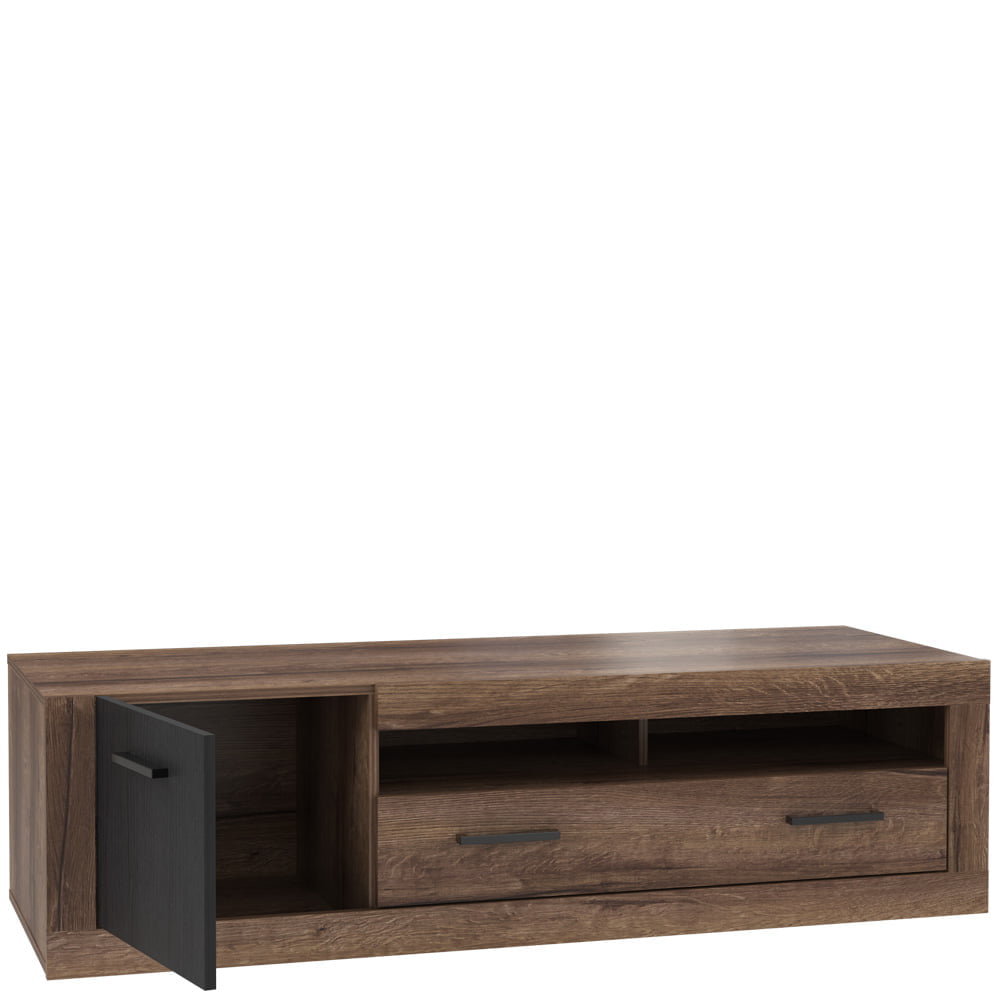 Funkcjonalna szafka RTV to obowiązkowy element każdego salonu i pokoju dziennego. Posiada zamykaną półkę, szeroką podwójną szufladę oraz dwie wnęki na dekoder i sprzęt RTV. Kształt bryły podkreśla szeroka, masywna rama otaczająca mebel, a ciemna wstawka (w dekorze Dąb Czarny) i uchwyty w czarnym kolorze uwydatniają jej ciekawą asymetryczną formę.