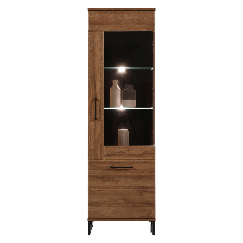 IVO to rozbudowana kolekcja mebli, utrzymana w nowoczesnej stylistyce, która idealnie sprawdzi się nie tylko w salonie ale także w innych pomieszczeniach takich jak jadalnia czy przedpokój. Poszczególne bryły zostały starannie zaprojektowane, dzięki czemu otrzymujemy nowoczesne, a zarazem praktyczne meble. Fronty zostały wykonane z płyty MDF w dekorze dąb april ze strukturą imitującą naturalne drewno. Korpusy wykonano z wysokiej jakości płyty laminowanej w kolorze dąb april. To meble o ciekawej estetyce łączącej elegancką klasykę z nutką industrialnego stylu. Całość dopełniają masywne metalowe nogi oraz uchwyty w czarnym kolorze. Solidne wykonanie mebli gwarantuje ich stabilność oraz bezpieczeństwo użytkowania przez długie lata. Dodatkowym atutem jest bogate wyposażenie, które znajdziemy w standardzie między innymi wysokiej jakości prowadnice kulkowe, system cichego domyku drzwi oraz podświetlenie LED 3D półek szklanych